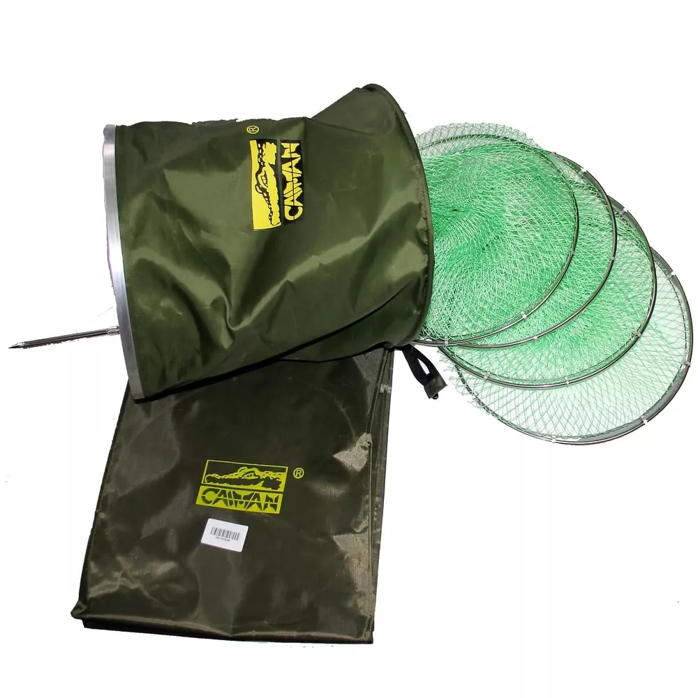 Садок CAIMAN береговой. Кольца садка металлические, круглой формы. Материал синтетический капрон. Ячейка 15 мм. Садок комплектуется сумкой для переноски из водонепроницаемой ткани и колышком длиной 25 см., для установки на берегу.
