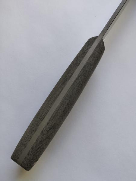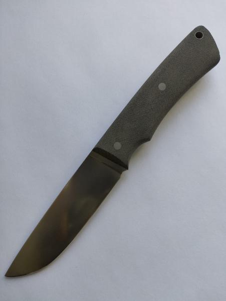 Материал рукояти — микарта. Микарта — это композитный материал на основе синтетических смол и ткани либо плотной бумаги. Популярность микарты как материала для рукояти обусловлена рядом её особенных свойств, в первую очередь водостойкостью. Микарта прочная, нескользкая, не впитывает запахи и комфортная для руки. Кроме того, материал красив, долговечен, хорошо переносит значительные перепады температуры, не вступает в реакцию со многими химическими веществами и имеет широкую цветовую гамму. Эти качества делают её более востребованной в ножевой индустрии, чем обычный пластик или дерево. При этом микарта, как и древесина, является материалом теплым для рук.