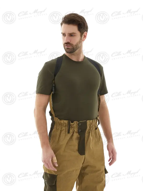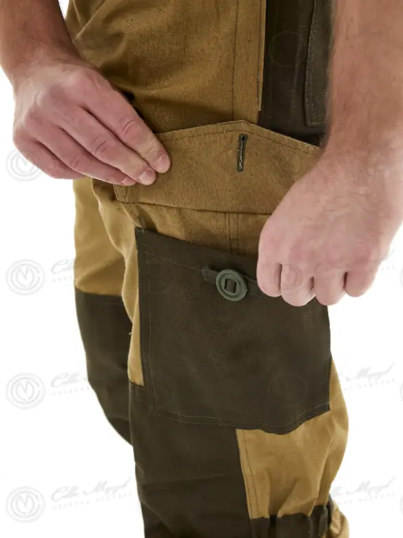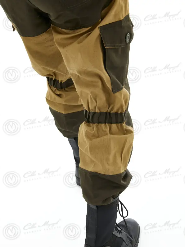 Полуприлегающего силуэта, при помощи резинок в области талии, на рукавах и на брюках. Оснащен центральной застежкой на молнии и защищающей от ветра планкой и пуговицами. Капюшон с планкой и шнуром для утяжки. Для улучшения износостойкости предусмотрено усиление локтевой части рукава, коленной и задней части брюк. На куртке предусмотрены 4 вида накладных карманов. На передней части куртки в области груди 4 накладных кармана: 2 верхних с клапаном и 2 с молнией. Нижних 4 накладных кармана с клапаном и накладной карман с клапаном на рукавах. Брюки с поясом на резинке и дополнительно с подтяжками, с центральной застежкой на молнии, пуговицах и гульфике. 2 кармана на молнии в боковом шве, 2 накладных кармана на задней части брюк, 2 боковых накладных кармана с клапаном. По нижней части брюк предусмотрен манжет с резинкой и ветрозащитой.