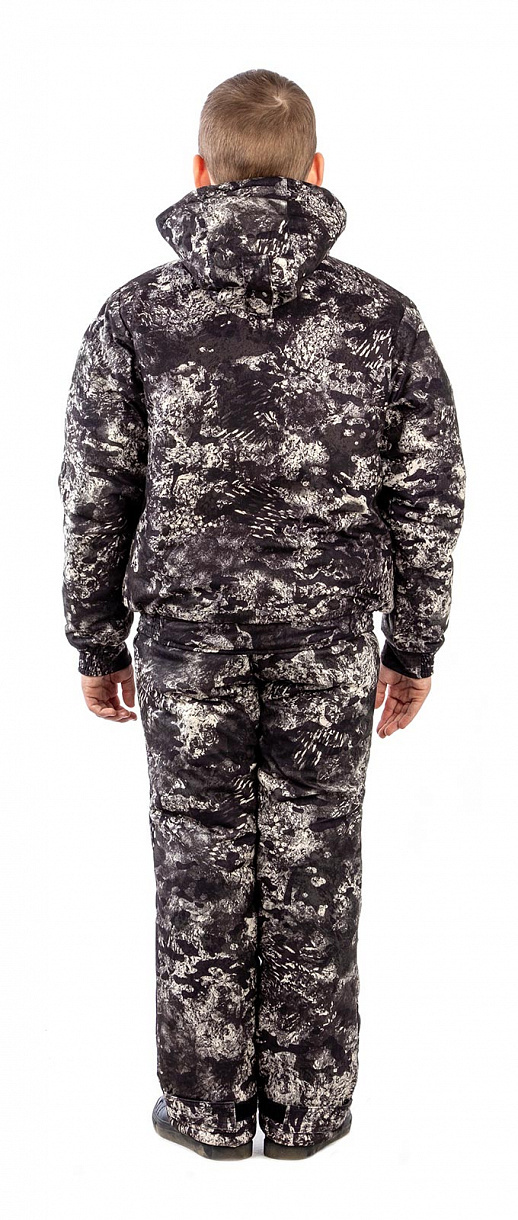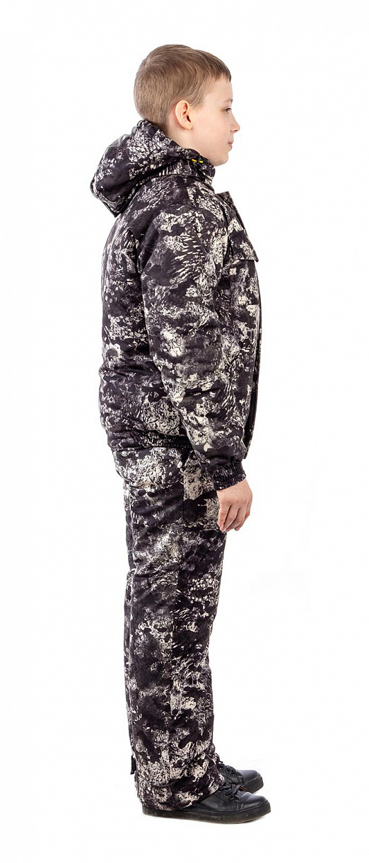 Низ укороченной куртки и рукава собраны на широкую простроченную резинку. Нижние карманы без застежки для согрева рук утеплены флисом. Два нагрудных кармана закрываются на кнопки. Внутренний карман для документов закрывается на липучку. Центральная застежка куртки на надежной витой молнии закрыта ветрозащитной планкой на кнопках. Отстегивающийся капюшон и высокий воротник утеплены флисом. Высокий полукомбинезон с регулируемыми лямками и регулировкой по низу брюк.