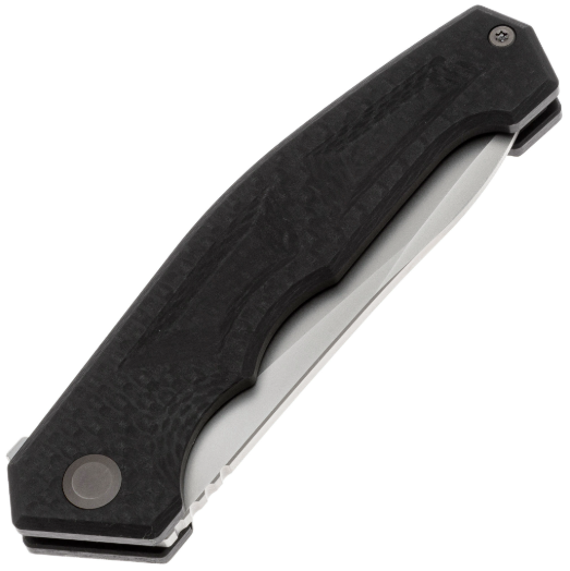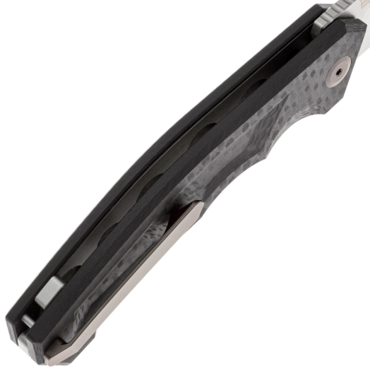 Рукоять ножа выполнена из G10, покрытого слоем карбона. G10 — это композитный материал, в основе которого лежат стеклоткань и эпоксидная смола. Стекловолокно вымачивается в эпоксидной смоле, после чего подвергается сжатию. На выходе получается прочный и неприхотливый материал, устойчивый к ударам, влаге и высокой температуре. G10 прекрасно противостоит агрессивной внешней среде, благодаря чему имеет высокую популярность у производителей фиксированных и складных ножей. Внешне G10 похож на микарту, но превосходит её в прочности и огнестойкости. Также на рукояти ножа имеется фрезерованная клипса для ношения.