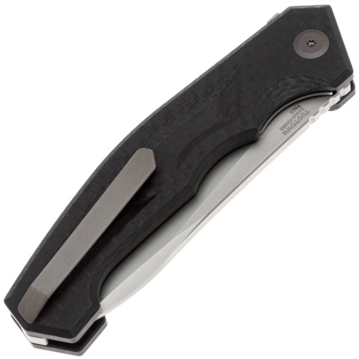 Форма клинка Drop Point позволяет эффективно выполнять различные задачи - от нарезки до проколов. Клинок ножа выполнен из стали T10S, которая широко используется благодаря своей высокой твёрдости и износостойкости. Сталь T10S — высокоуглеродистая и коррозионностойкая сталь, содержащая легирующие элементы: кобальт и молибден. Она производится по специальному заказу компании TuoTown в Китае. По своим свойствам сталь T10S является полным аналогом японской стали Vg-10. В настоящее время найти оригинальную японскую сталь на рынке очень сложно и дорого. Однако за долгие годы существования Vg-10 другие металлургические производства научились создавать её аналоги. Поэтому, чтобы не вводить покупателей в заблуждение, компания TuoTown решила использовать свою марку стали. Твёрдость её достигает 60 HRC, что делает нож острым и долговечным. Однако важно отметить, что сталь T10S не является нержавеющей, поэтому для поддержания её качеств требуется правильный уход, особенно в условиях повышенной влажности или агрессивной среды. Обработка клинка производится методом Bead Blast, при котором поверхность "бомбардируется" мелкими стеклянными или корундовыми частичками. Это придаёт клинку матовый сероватый оттенок и делает его менее подверженным царапинам и следам использования. Нож оснащён надёжным замком, который обеспечивает безопасность при работе с ножом. Открытие ножа осуществляется с помощью фронт-флиппера, а благодаря осевому узлу с керамическими подшипниками, механизм открытия становится более плавным, что обеспечивает комфортное использование ножа без лишних усилий.