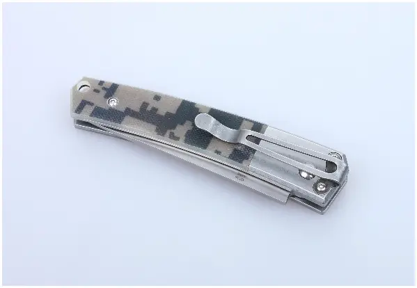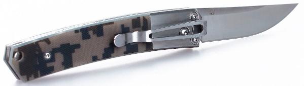 Часть рукоятки также изготовлена из металла. На остальную поверхность изготовлены накладки из G10. Этот материал по сути является композитным соединением эпоксидной смолы и стекловолокна. Он чрезвычайно прочный и гарантирует длительное сохранение изначально заложенных свойств. Поверхность накладок имеет рельефную поверхность, которая помогает крепче держать нож в руке и не дает ему выскользнуть из ладоней. На рукоятке также есть небольшое сквозное отверстие, в которое пользователь может продеть темляк, и металлическая клипса для крепления и страховки ножа во время транспортировки.