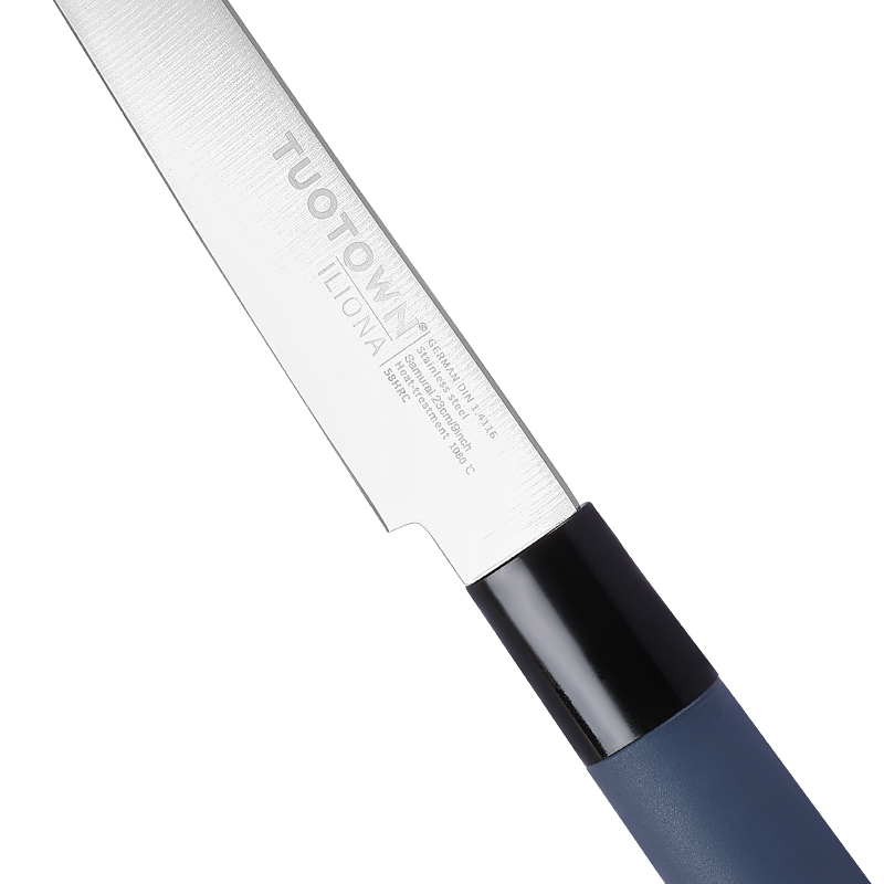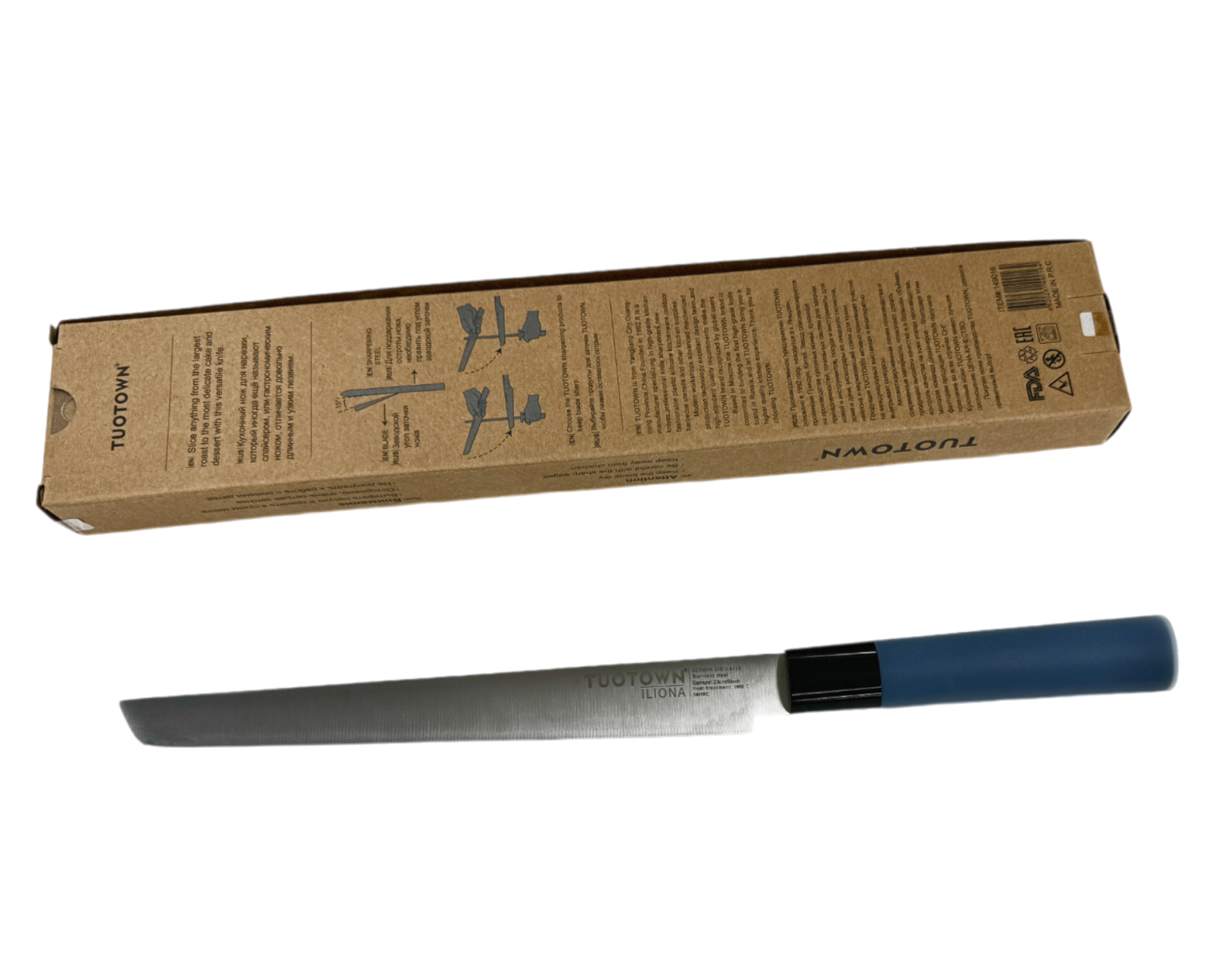 Кухонный нож для нарезки Iliona Samurai от бренда Tuotown подходит для разрезания различных продуктов, включая свежие овощи, фрукты, мясо и рыбу.