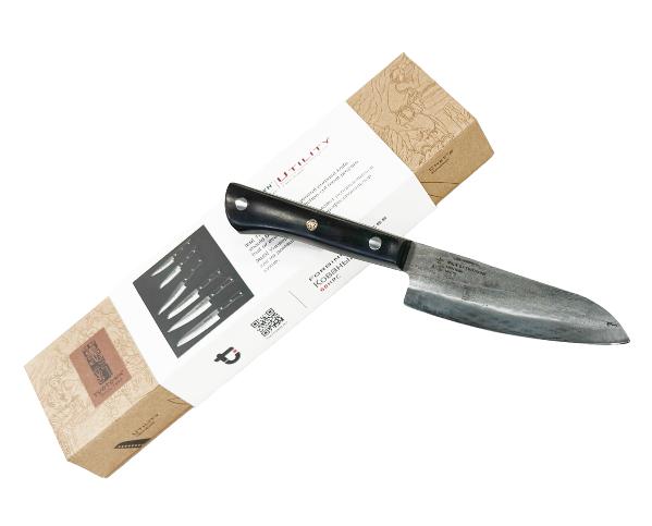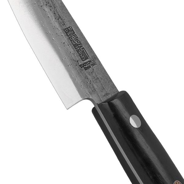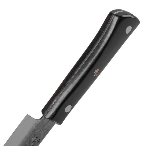 Клинок выполнен из стали Aus-10. AUS-10 — это высококачественная японская нержавеющая сталь, производимая компанией Aichi Steel. Она является частью семейства AUS-сталей (AUS-6, AUS-8, AUS-10), каждая из которых отличается содержанием углерода и элементами легирования. AUS-10 считается самой твердой и износостойкой в своей линейке, благодаря чему её часто сравнивают с такими премиальными сталями, как VG-10 и 154CM. Химический состав обеспечивает прочный каркас, устойчивый к износу и ржавчине, а также сохраняющий остроту в течение длительного времени. AUS-10 обладает твердостью порядка 58-61 HRC по шкале Роквелла. Это делает ножи из этой стали достаточно прочными, но в то же время — не слишком хрупкими. Несмотря на высокую твердость, AUS-10 сохраняет хорошую обрабатываемость. Она поддается заточке даже с помощью бытовых точилок и камней, особенно если использовать правильный угол заточки — около 15–20 градусов. Высокое содержание хрома делает AUS-10 нержавеющей сталью. Но всё-таки для сохранения антикоррозийных свойств нож необходимо регулярно вытирать насухо после использования и не оставлять в воде. AUS-10 часто используется в японских кухонных ножах — сантоку, гюто, накири. Она идеальна для нарезки овощей, мяса, рыбы и даже хлеба.