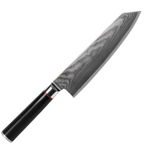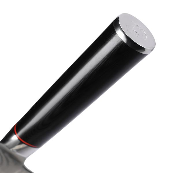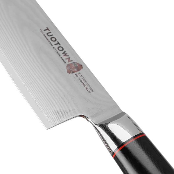 Лезвие ножа изготовлено из высококачественной нержавеющей стали VG-10 в обкладках из дамаска (близкий по составу аналог китайского производства). Центральную часть клинка ножа обкладывают дамаском для создания прочного ножа с твёрдой центральной режущей частью, которая благодаря мягким обкладкам выдерживает серьёзные боковые нагрузки. Также обкладки из дамаска отвечают за остроту режущей кромки и изысканный внешний вид лезвия. VG-10 — это коррозионностойкая сталь, разработанная японской компанией «Takefu Special Steel» специально для изготовления ножей. V Gold 10 (сокращенно VG-10) стала причиной всемирной популярности этой компании. Эта сталь имеет крайне высокие показатели износостойкости за счёт легирования кобальтом, закаляется до 60-62 HRC, но при этой твёрдости может приобретать значительную хрупкость, поэтому стоит избегать тяжёлых работ по грубым материалам. Однако при закалке 58 HRC эта сталь начинает выдерживать довольно высокие нагрузки. VG-10 хорошо поддаётся заточке, но стоит быть осторожным с использованием алмазных и эльборовых брусков, так как они могут привести к выкрашиванию режущей кромки. Эта сталь хорошо поддаётся шлифовке и термообработке, также она хорошо держит режущую кромку и при должном уходе прослужит вам долго. Также стоит обратить внимание на то, что VG-10 имеет довольно среднюю устойчивость к коррозии и в влажном климате или частом контакте с жидкостями она требует тщательного ухода. Дамаск — это сталь, полученная методом кузнечной ковки из пакета, состоящего из металла разного сорта. Благодаря наличию этих слоев, нож из дамасской стали имеет на поверхности характерный рисунок. Главное достоинство дамаска — сочетание твердости и гибкости, которая получается как раз из-за «смешивания» разносортного металла.