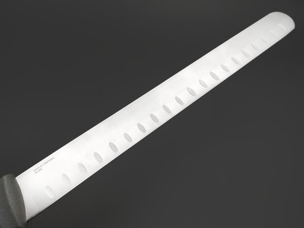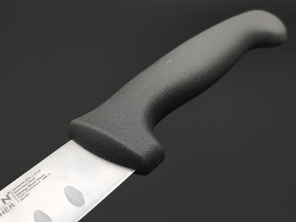 Клинок этого высококачественного инструмента изготовлен из немецкой нержавеющей стали марки German DIN 1.4116 (близкий по составу аналог китайского производства) — мартенситная нержавеющая сталь высокого класса, которая отличается высокой коррозионной стойкостью, механической прочностью и способностью длительное время удерживать остроту режущей кромки. Вдоль лезвия есть выемки (грантоны) для предотвращения прилипания продуктов к лезвию в процессе нарезки. Твёрдость по Роквеллу варьируется от 56 до 60 HRC. Клинок данного ножа закален 58 HRC. Благодаря этому нож не только острый, но и долговечный, сохраняет свои качества даже при длительном использовании в агрессивных условиях.