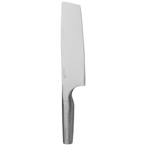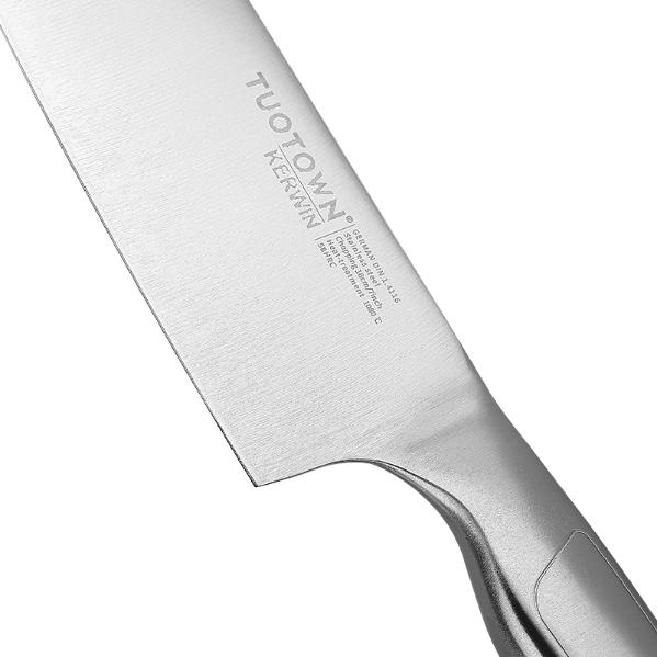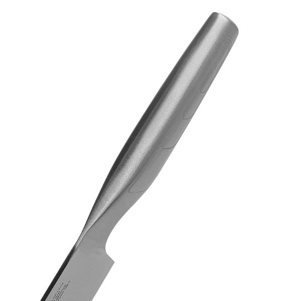 Удобная рукоять ножа сделана из нержавеющей стали, внутри полая, что значительно уменьшает вес ножа, чтобы рука не уставала даже во время длительного пользования. Нержавеющая сталь — простой и недорогой материал, с отменными механическими характеристиками, высокой стойкостью к коррозии и доступной ценой. Этот материал часто используется для изготовления рукояток кухонных ножей. Здесь на первый план выходят такие свойства нержавеющей стали, как стойкость к агрессивным средам (кислота, щелочь) и гигиеничность. Кухонный нож с рукояткой из нержавеющей стали легко очистить и вымыть, нержавеющая сталь не боится воды и перепада температур. Такой нож можно мыть в посудомоечной машине.