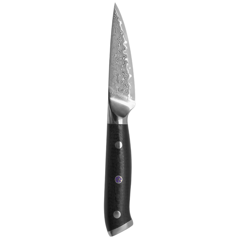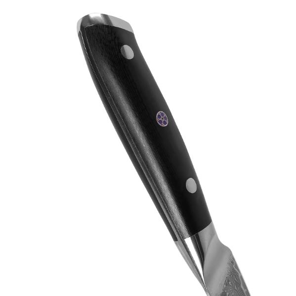 Клинок выполнен из стального ламината, где на обкладках используется дамасская сталь, а сердцевина изготовлена из японской VG10. Центральную часть клинка ножа обкладывают дамаском для создания прочного ножа с твёрдой центральной режущей частью, которая благодаря мягким обкладкам выдерживает серьёзные боковые нагрузки. Также обкладки из дамаска отвечают за остроту режущей кромки и изысканный внешний вид лезвия. VG-10 — это коррозионностойкая сталь, разработанная японской компанией «Takefu Special Steel» специально для изготовления ножей. V Gold 10 (сокращенно VG-10) стала причиной всемирной популярности этой компании. Эта сталь имеет крайне высокие показатели износостойкости за счёт легирования кобальтом, закаляется до 60-62 HRC, но при этой твёрдости может приобретать значительную хрупкость, поэтому стоит избегать тяжёлых работ по грубым материалам. Однако при закалке 58 HRC эта сталь начинает выдерживать довольно высокие нагрузки. VG-10 хорошо поддаётся заточке, но стоит быть осторожным с использованием алмазных и эльборовых брусков, так как они могут привести к выкрашиванию режущей кромки. Эта сталь хорошо держит режущую кромку и при должном уходе прослужит вам долго. Также стоит обратить внимание на то, что VG-10 имеет довольно среднюю устойчивость к коррозии и в влажном климате или частом контакте с жидкостями она требует тщательного ухода. Дамаск — это сталь, полученная методом кузнечной ковки из пакета, состоящего из металла разного сорта. Благодаря наличию этих слоев, нож из дамасской стали имеет на поверхности характерный рисунок. Главное достоинство дамаска — сочетание твердости и гибкости, которая получается как раз из-за «смешивания» разносортного металла.