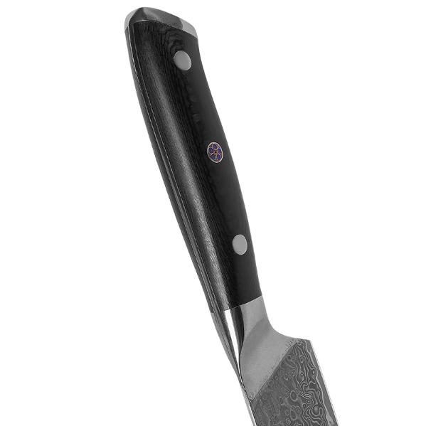Клинок выполнен из стального ламината, где на обкладках используется дамасская сталь, а сердцевина изготовлена из японской VG10. Центральную часть клинка ножа обкладывают дамаском для создания прочного ножа с твёрдой центральной режущей частью, которая благодаря мягким обкладкам выдерживает серьёзные боковые нагрузки. Также обкладки из дамаска отвечают за остроту режущей кромки и изысканный внешний вид лезвия. VG-10 — это коррозионностойкая сталь, разработанная японской компанией «Takefu Special Steel» специально для изготовления ножей. V Gold 10 (сокращенно VG-10) стала причиной всемирной популярности этой компании. Эта сталь имеет крайне высокие показатели износостойкости за счёт легирования кобальтом, закаляется до 60-62 HRC, но при этой твёрдости может приобретать значительную хрупкость, поэтому стоит избегать тяжёлых работ по грубым материалам. Однако при закалке 58 HRC эта сталь начинает выдерживать довольно высокие нагрузки. VG-10 хорошо поддаётся заточке, но стоит быть осторожным с использованием алмазных и эльборовых брусков, так как они могут привести к выкрашиванию режущей кромки. Эта сталь хорошо держит режущую кромку и при должном уходе прослужит вам долго. Также стоит обратить внимание на то, что VG-10 имеет довольно среднюю устойчивость к коррозии и в влажном климате или частом контакте с жидкостями она требует тщательного ухода. Дамаск — это сталь, полученная методом кузнечной ковки из пакета, состоящего из металла разного сорта. Благодаря наличию этих слоев, нож из дамасской стали имеет на поверхности характерный рисунок. Главное достоинство дамаска — сочетание твердости и гибкости, которая получается как раз из-за «смешивания» разносортного металла.