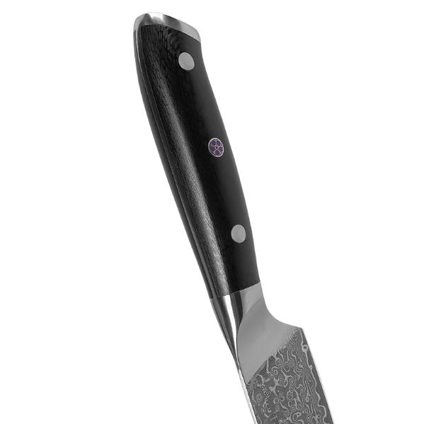 Клинок выполнен из стального ламината, где на обкладках используется дамасская сталь, а сердцевина изготовлена из японской VG10. Центральную часть клинка ножа обкладывают дамаском для создания прочного ножа с твёрдой центральной режущей частью, которая благодаря мягким обкладкам выдерживает серьёзные боковые нагрузки. Также обкладки из дамаска отвечают за остроту режущей кромки и изысканный внешний вид лезвия. VG-10 — это коррозионностойкая сталь, разработанная японской компанией «Takefu Special Steel» специально для изготовления ножей. V Gold 10 (сокращенно VG-10) стала причиной всемирной популярности этой компании. Эта сталь имеет крайне высокие показатели износостойкости за счёт легирования кобальтом, закаляется до 60-62 HRC, но при этой твёрдости может приобретать значительную хрупкость, поэтому стоит избегать тяжёлых работ по грубым материалам. Однако при закалке 58 HRC эта сталь начинает выдерживать довольно высокие нагрузки. VG-10 хорошо поддаётся заточке, но стоит быть осторожным с использованием алмазных и эльборовых брусков, так как они могут привести к выкрашиванию режущей кромки. Эта сталь хорошо держит режущую кромку и при должном уходе прослужит вам долго. Также стоит обратить внимание на то, что VG-10 имеет довольно среднюю устойчивость к коррозии и в влажном климате или частом контакте с жидкостями она требует тщательного ухода. Дамаск — это сталь, полученная методом кузнечной ковки из пакета, состоящего из металла разного сорта. Благодаря наличию этих слоев, нож из дамасской стали имеет на поверхности характерный рисунок. Главное достоинство дамаска — сочетание твердости и гибкости, которая получается как раз из-за «смешивания» разносортного металла.