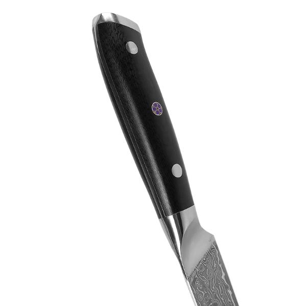 Клинок выполнен из стального ламината, где на обкладках используется дамасская сталь, а сердцевина изготовлена из японской VG10. Центральную часть клинка ножа обкладывают дамаском для создания прочного ножа с твёрдой центральной режущей частью, которая благодаря мягким обкладкам выдерживает серьёзные боковые нагрузки. Также обкладки из дамаска отвечают за остроту режущей кромки и изысканный внешний вид лезвия. VG-10 — это коррозионностойкая сталь, разработанная японской компанией «Takefu Special Steel» специально для изготовления ножей. V Gold 10 (сокращенно VG-10) стала причиной всемирной популярности этой компании. Эта сталь имеет крайне высокие показатели износостойкости за счёт легирования кобальтом, закаляется до 60-62 HRC, но при этой твёрдости может приобретать значительную хрупкость, поэтому стоит избегать тяжёлых работ по грубым материалам. Однако при закалке 58 HRC эта сталь начинает выдерживать довольно высокие нагрузки. VG-10 хорошо поддаётся заточке, но стоит быть осторожным с использованием алмазных и эльборовых брусков, так как они могут привести к выкрашиванию режущей кромки. Эта сталь хорошо держит режущую кромку и при должном уходе прослужит вам долго. Также стоит обратить внимание на то, что VG-10 имеет довольно среднюю устойчивость к коррозии и в влажном климате или частом контакте с жидкостями она требует тщательного ухода. Дамаск — это сталь, полученная методом кузнечной ковки из пакета, состоящего из металла разного сорта. Благодаря наличию этих слоев, нож из дамасской стали имеет на поверхности характерный рисунок. Главное достоинство дамаска — сочетание твердости и гибкости, которая получается как раз из-за «смешивания» разносортного металла.