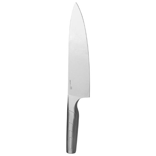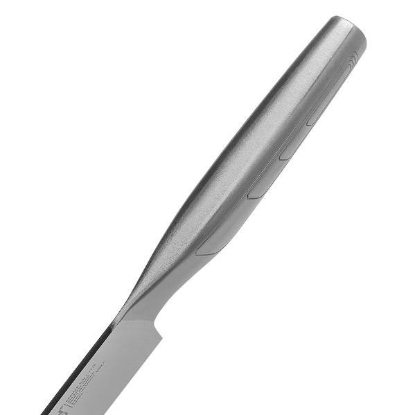 Удобная рукоять ножа сделана из нержавеющей стали, внутри полая, что значительно уменьшает вес ножа, чтобы рука не уставала даже во время длительного пользования. Нержавеющая сталь — простой и недорогой материал, с отменными механическими характеристиками, высокой стойкостью к коррозии и доступной ценой. Этот материал часто используется для изготовления рукояток кухонных ножей. Здесь на первый план выходят такие свойства нержавеющей стали, как стойкость к агрессивным средам (кислота, щелочь) и гигиеничность. Кухонный нож с рукояткой из нержавеющей стали легко очистить и вымыть, нержавеющая сталь не боится воды и перепада температур. Такой нож можно мыть в посудомоечной машине.