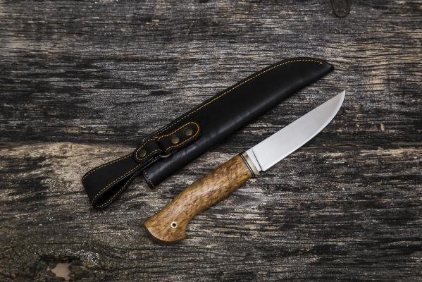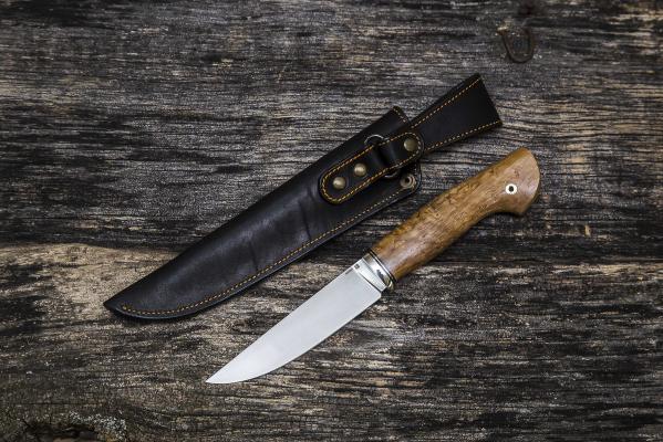 Рукоять ножа выполнена из стабилизированной карельской берёзы. Стабилизированная - это пропитанная полимерными растворами древесина, отличающаяся большой устойчивостью к воздействию влаги, износостойкостью и прочностью. Карельская берёза - это сочетание красоты и функциональности. Её уникальный выразительный рисунок придаёт каждому ножу эксклюзивность и эстетическую ценность, что особенно ценится коллекционерами. Кроме того, карельская берёза обладает высокой прочностью и устойчивостью к износу, что делает её идеальной для интенсивного использования, Берёза хорошо переносит влагу, что делает её подходящей для использования ножей в различных условиях, включая открытый воздух и повышенную влажность. Эргономичная форма рукояти обеспечивает комфортное и уверенное удерживание ножа даже в сложных условиях и позволяет уверенно справляться с любыми задачами. Отверстие для темляка добавляет дополнительную удобство в использовании.