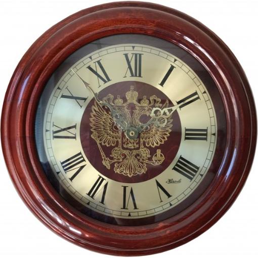 Часы Ч-02 Герб РФ – это массивный деревянный корпус круглой формы, часовая и минутная стрелки. Удивительное сочетание оригинальности, необычности и отсутствия излишеств в дизайне. На устройстве изображен герб РФ.