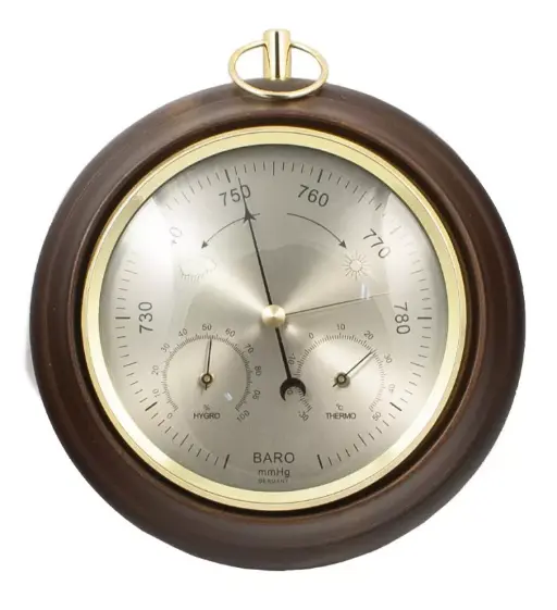 Стрелочный анероидный барометр — механический бытовой прибор, полностью автономный и безопасный, ведь для работы ему не нужна ртуть, батарейки, подключение к электросети или Power Bank. Такой барометр можно повесить на стену и отслеживать изменения атмосферного давления от 710 до 800 мм ртутного столба. Когда давление падает, стрелка смещается в сторону рисунка «дождевая тучка», а значит, ожидаются осадки. Когда давление повышается, стрелка смещается в сторону рисунка «солнышко», а значит, установится ясная погода. Чтобы барометр работал правильно, необходимо провести начальную корректировку, подробно описанную в инструкции (прилагается к прибору).