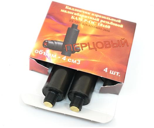 Баллончики аэрозольные малогабаритные резьбовые перцовые 18x60 (БАМ.Р-ОС) предназначены для использования в комплексе с простыми, надежными и дешевыми пусковыми устройствами - "стреляющими авторучками" для сигнальных резьбовых патронов "Сигнал охотника", что существенно расширяет возможность применения гражданами аэрозольных средств в целях самообороны. БАМ.Р-ОС 18х60 может использоваться также и с устройствами аэрозольными модели "Чародей".