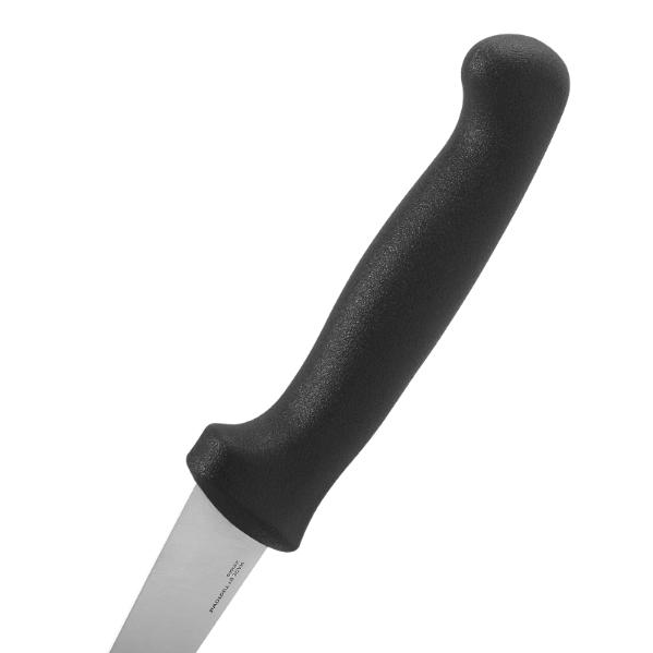 Удобная рукоять ножа сделана из прочного ABC пластика, что обеспечивает его комфортное использование в течение длительного времени и безопасность во время работы. АБС-пластик (акрилонитрилбутадиенстирол) — это ударопрочная техническая термопластическая смола на основе сополимера акрилонитрила с бутадиеном и стиролом. АБС-пластик способен выдерживать значительные механические нагрузки и удары. Материал сохраняет свои свойства при температуре до +90 °C и начинает размягчаться при более высоких значениях, устойчив к воздействию кислот, щелочей и солей. Благодаря эргономичной форме и продуманной рукоятке из ABS пластика, работа с данным ножом будет приятна продолжительное время.