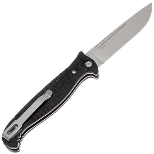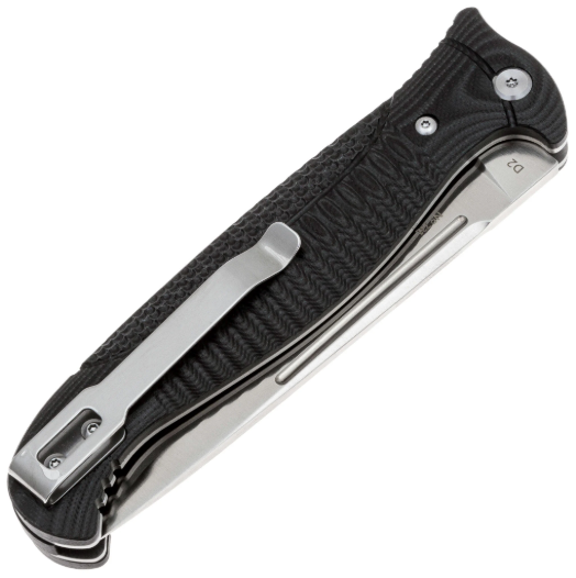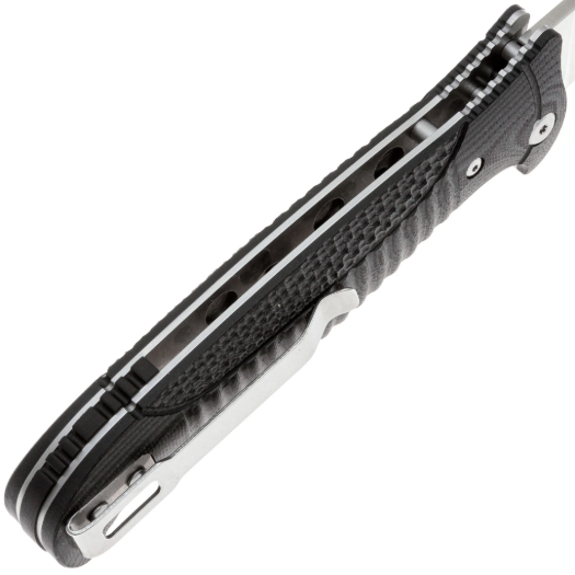 Рукоять изготовлена из стеклотекстолита G10 с текстурированной поверхностью, что обеспечивает надёжный и комфортный хват. G10 — это композитный материал, в основе которого лежат стеклоткань и эпоксидная смола. Стекловолокно вымачивается в эпоксидной смоле, после чего подвергается сжатию. На выходе получается прочный и неприхотливый материал, устойчивый к ударам, влаге и высокой температуре. G10 прекрасно противостоит агрессивной внешней среде, благодаря чему имеет высокую популярность у производителей фиксированных и складных ножей. Такие ножи могут иметь самый широкий спектр применения от EDC, до работы в экстремальных условиях. Ещё одно преимущество это стеклотекстолита – он легко поддаётся окрашиванию в любые цвета. Внешне G10 похож на микарту, но превосходит её в прочности и огнестойкости. Для ношения ножа предусмотрена стальная клипса, которая позволяет удобно закрепить его в кармане.
