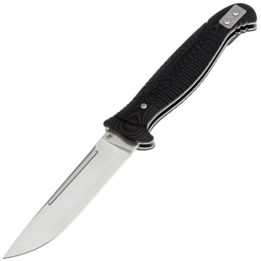Клинок ножа Финка выполнен из стали D2, характеризующейся высокой твердостью, отличной износостойкостью, неплохой стойкостью к коррозии и длительным удержанием остроты режущей кромки. Это инструментальная сталь американского производства. D2 одна из самых популярных ножевых сталей в мире. Она содержит 12% хрома, что не позволяет ей называться нержавеющей, поэтому стоит избегать длительного контакта с влагой и после работы ножом, клинок необходимо протирать насухо. И всё же D2 достаточно хорошо противодействует коррозии. Также из положительных характеристик стоит отметить, что она обладает неплохой ударной вязкостью, устойчива к выкрашиванию режущей кромки и подходит как для грубой работы, так и для точных резов. Клинок имеет сатиновую обработку, которая придаёт ему современный вид и упрощает обслуживание. Надёжный замок Phanom-lock фиксирует клинок в открытом положении, предотвращая случайное закрытие. Для разблокировки нужно просто сместить накладку на рукояти, что делает управление ножом интуитивно понятным и безопасным.