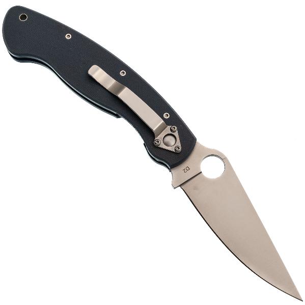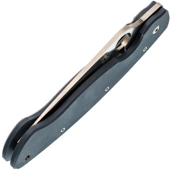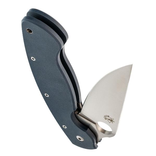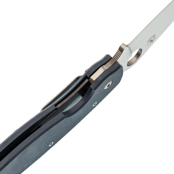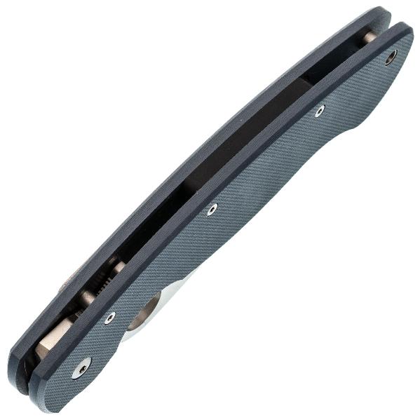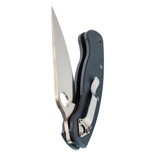 Клинок выполнен в форме Drop-Point, которая обеспечивает хорошую проникающую способность и эффективный рез. Клинок выполнен из стали D2, которая славится своей высокой твёрдостью и отличной износостойкостью. Это инструментальная сталь американского производства. D2 одна из самых популярных ножевых сталей в мире. Она содержит 12% хрома, что не позволяет ей называться нержавеющей, поэтому после работы с ножом, клинок необходимо протирать насухо. Из положительных характеристик стоит отметить, что она хорошо держит режущую кромку острой и обладает неплохой ударной вязкостью. Клинок обладает хорошей проникающей способностью. Сатиновая обработка клинка придаёт ему элегантный матовый блеск. Открывается он с помощью подпальцевого отверстия, что обеспечивает плавное и удобное открытие. Рифление на обухе позволяет контролировать нож при выполнении точных и силовых работ, а замок Liner-lock надёжно фиксирует клинок в открытом положении.
