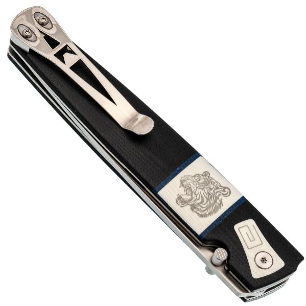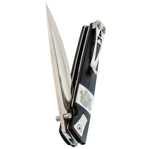 Рукоять выполнена из стеклотекстолита G10 с текстурированной поверхностью, что гарантирует надёжный и комфортный хват в любых условиях. G10 — это композитный материал, в основе которого лежат стеклоткань и эпоксидная смола. Стекловолокно вымачивается в эпоксидной смоле, после чего подвергается сжатию. На выходе получается прочный и неприхотливый лёгкий материал, устойчивый к ударам, влаге и высокой температуре. G10 прекрасно противостоит агрессивной внешней среде, благодаря чему имеет высокую популярность у производителей фиксированных и складных ножей. Такие ножи могут иметь самый широкий спектр применения от EDC, до работы в экстремальных условиях. Ещё одно преимущество это стеклотекстолита – он легко поддаётся окрашиванию в любые цвета. Внешне G10 похож на микарту, но превосходит её в прочности и огнестойкости. Для удобства ношения предусмотрена клипса, которая позволяет закрепить нож на кармане в удобном для вас положении.