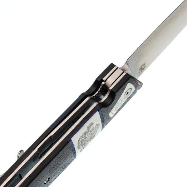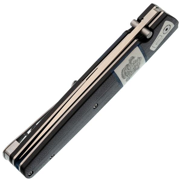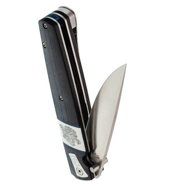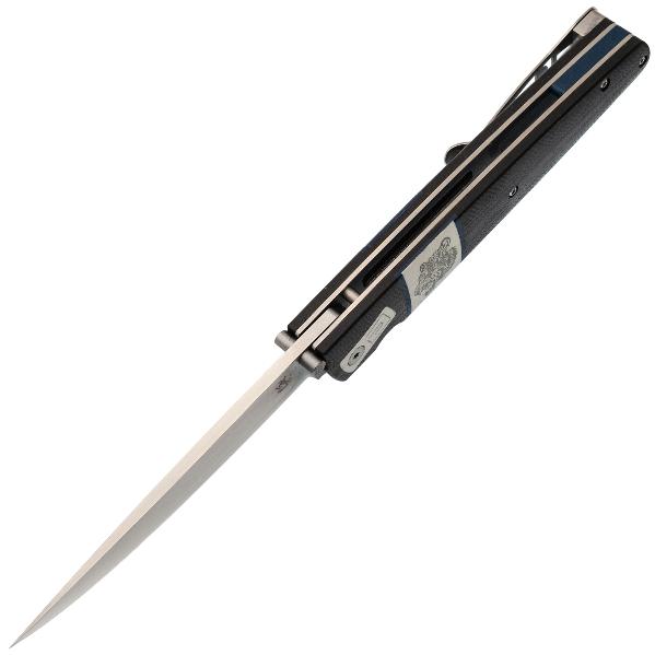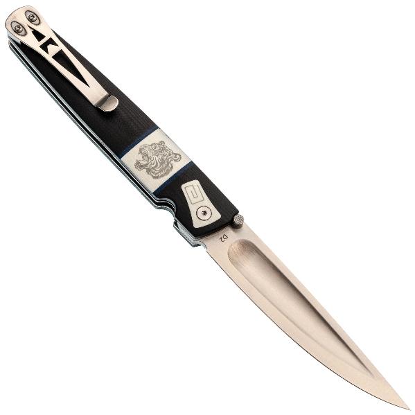 Клинок имеет асимметричную заточку: с правой стороны (для правши) лезвие плоское с долом (выемкой), а с левой — выпуклое (линзовидное). Это главная отличительная черта. Такая форма облегчает резку и строгание, предотвращает заклинивание в материале. делая нож незаменимым в быту и промыслах северных народов. Клинок ножа Саха Волк выполнен из стали D2, характеризующейся высокой твердостью, отличной износостойкостью, неплохой стойкостью к коррозии и длительным удержанием остроты режущей кромки. Это инструментальная сталь американского производства. D2 одна из самых популярных ножевых сталей в мире. Она содержит 12% хрома, что не позволяет ей называться нержавеющей, поэтому стоит избегать длительного контакта с влагой и после работы ножом, клинок необходимо протирать насухо. И всё же D2 достаточно хорошо противодействует коррозии. Также из положительных характеристик стоит отметить, что она обладает неплохой ударной вязкостью, устойчива к выкрашиванию режущей кромки и подходит как для грубой работы, так и для точных резов. Обработка клинка выполнена методом сатинирования, что придаёт ему характерную штриховку, улучшая внешний вид. Раскрытие клинка происходит с помощью шпенька, гарантируя быстрое и лёгкое открытие одной рукой, что крайне важно в критических ситуациях. Надёжный замок Liner-lock гарантирует безопасность и надёжность фиксации клинка во время работы.