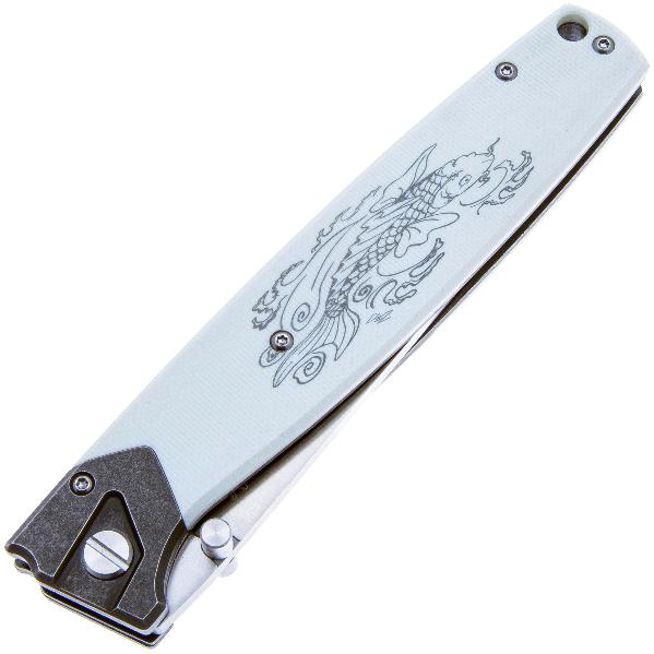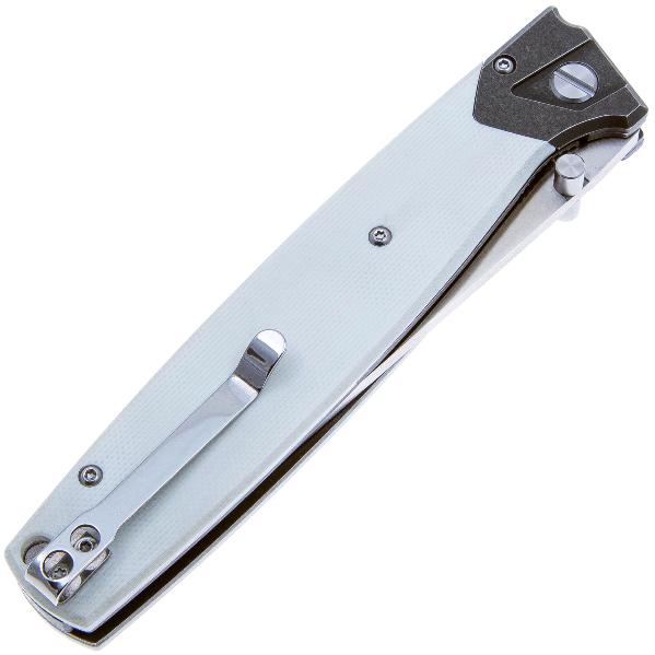 Рукоять выполнена из G10 -— это композитный материал, в основе которого лежат стеклоткань и эпоксидная смола. Стекловолокно вымачивается в эпоксидной смоле, после чего подвергается сжатию. На выходе получается прочный и неприхотливый материал, устойчивый к ударам, влаге и высокой температуре. G10 прекрасно противостоит агрессивной внешней среде, благодаря чему имеет высокую популярность у производителей фиксированных и складных ножей. Такие ножи могут иметь самый широкий спектр применения от EDC, до работы в экстремальных условиях. Ещё одно преимущество это стеклотекстолита – он легко поддаётся окрашиванию в любые цвета. Внешне G10 похож на микарту, но превосходит её в прочности и огнестойкости. Форма рукояти эргономичная, имеется металлическая клипса, которая позволяет закрепить нож на кармане в удобном для вас положении и предусмотрено темлячное отверстие.