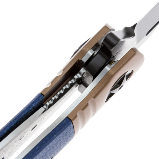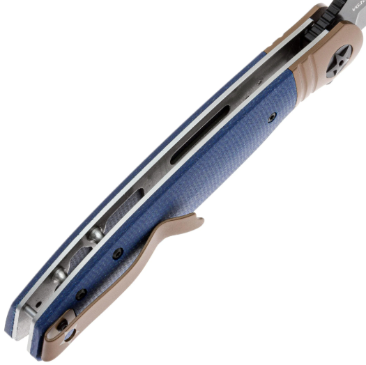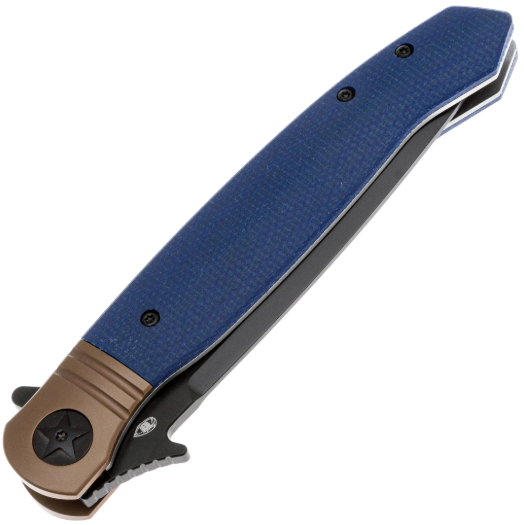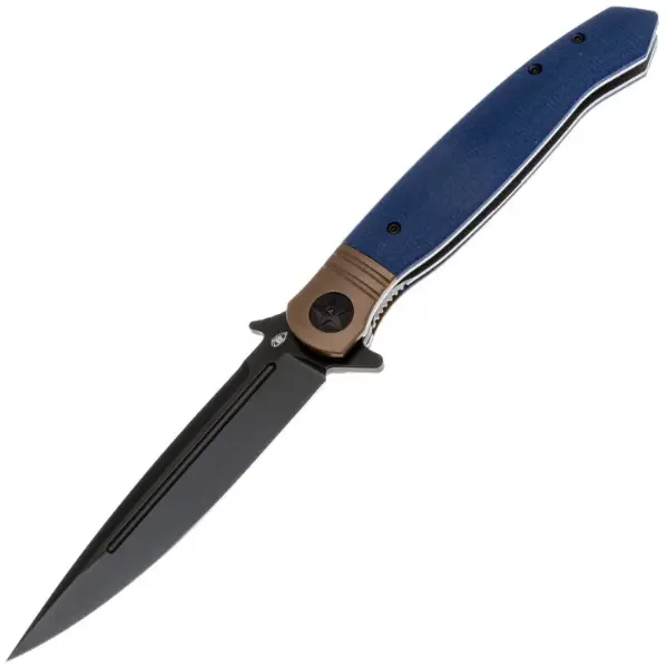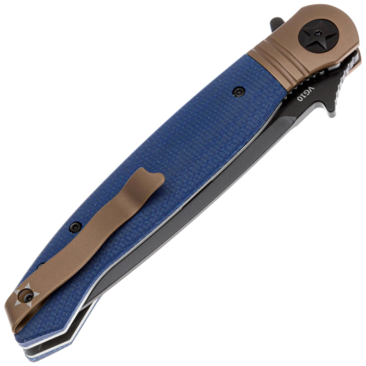 Клинок выполнен в популярной форме Drop-Point - универсальный профиль, подходящий для самых различных задач. Он изготовлен из стали VG-10 — это коррозионностойкая сталь, разработанная японской компанией «Takefu Special Steel» специально для изготовления ножей. V Gold 10 (сокращенно VG-10) стала причиной всемирной популярности этой компании. Эта сталь имеет крайне высокие показатели износостойкости за счёт легирования кобальтом, закаляется до 60-62 HRC, но при этой твёрдости может приобретать значительную хрупкость, поэтому стоит избегать тяжёлых работ по грубым материалам. Однако при закалке 58 HRC эта сталь начинает выдерживать довольно высокие нагрузки. VG-10 хорошо поддаётся заточке, но стоит быть осторожным с использованием алмазных и эльборовых брусков, так как они могут привести к выкрашиванию режущей кромки. Эта сталь хорошо поддаётся шлифовке и термообработке, также она хорошо держит режущую кромку и при должном уходе прослужит вам долго. Также стоит обратить внимание на то, что VG-10 имеет довольно среднюю устойчивость к коррозии и во влажном климате или частом контакте с жидкостями она требует тщательного ухода. Клинок имеет чёрное покрытие, которое уменьшает блики и дополнительно защищает сталь от коррозии. Спуски на 2/3 высоты клинка. На клинке имеется дол, раскрытие клинка происходит при помощи флиппера и фронтфлиппера, который формирует удобный упор на рукояти. За фиксацию отвечает liner-lock - надёжный и проверенный механизм, который отлично удерживает клинок в открытом положении.