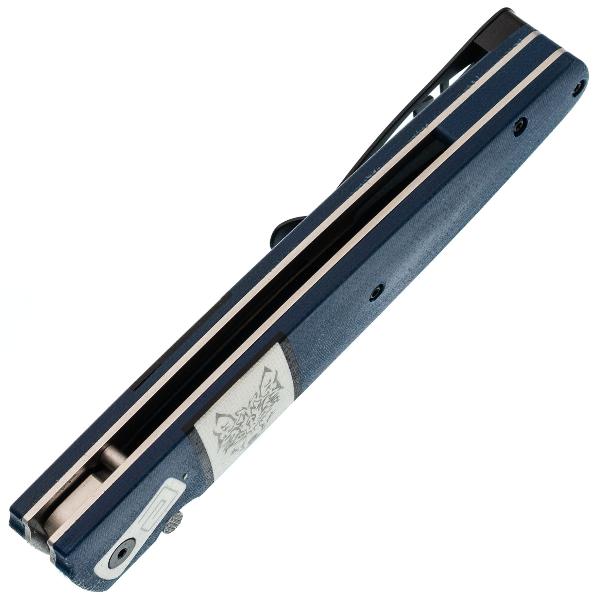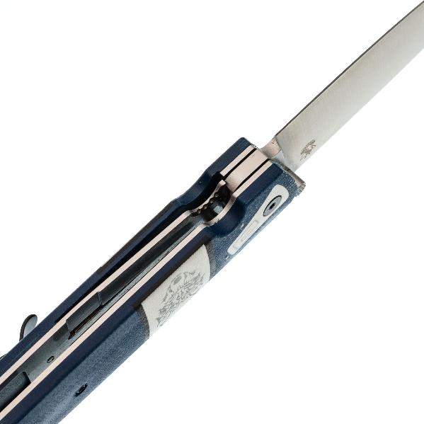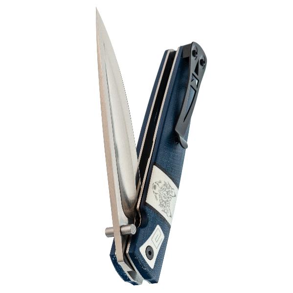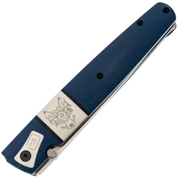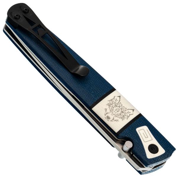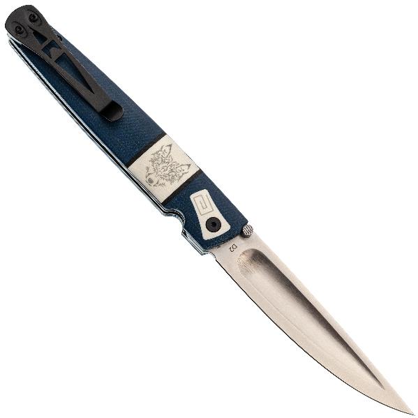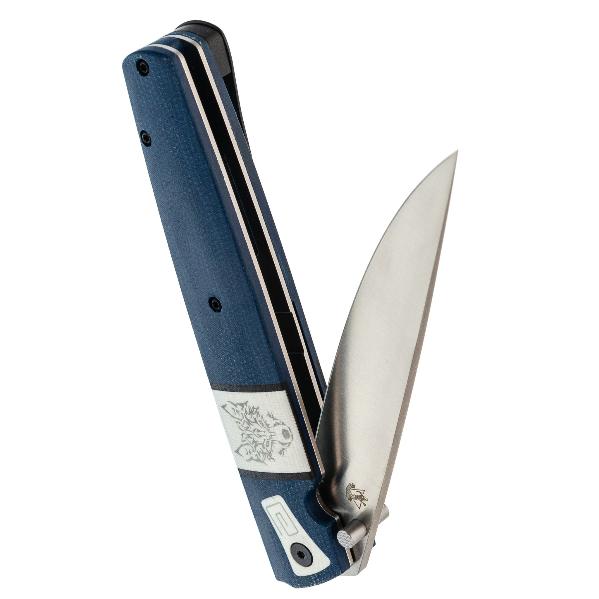 Клинок имеет асимметричную заточку: с правой стороны (для правши) лезвие плоское с долом (выемкой), а с левой — выпуклое (линзовидное). Это главная отличительная черта. Такая форма облегчает резку и строгание, предотвращает заклинивание в материале. делая нож незаменимым в быту и промыслах северных народов. Клинок ножа Саха Волк выполнен из стали D2, характеризующейся высокой твердостью, отличной износостойкостью, неплохой стойкостью к коррозии и длительным удержанием остроты режущей кромки. Это инструментальная сталь американского производства. D2 одна из самых популярных ножевых сталей в мире. Она содержит 12% хрома, что не позволяет ей называться нержавеющей, поэтому стоит избегать длительного контакта с влагой и после работы ножом, клинок необходимо протирать насухо. И всё же D2 достаточно хорошо противодействует коррозии. Также из положительных характеристик стоит отметить, что она обладает неплохой ударной вязкостью, устойчива к выкрашиванию режущей кромки и подходит как для грубой работы, так и для точных резов. Обработка клинка выполнена методом сатинирования, что придаёт ему характерную штриховку, улучшая внешний вид. Раскрытие клинка происходит с помощью шпенька, гарантируя быстрое и лёгкое открытие одной рукой, что крайне важно в критических ситуациях. Надёжный замок Liner-lock гарантирует безопасность и надёжность фиксации клинка во время работы.