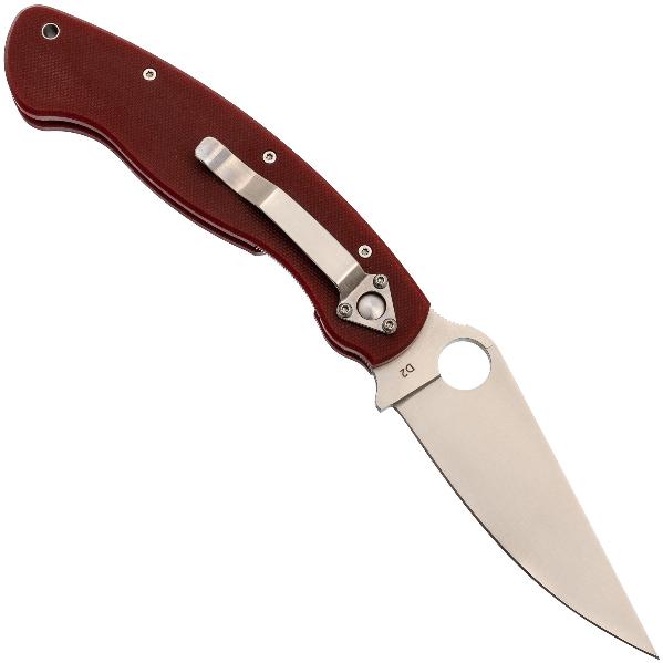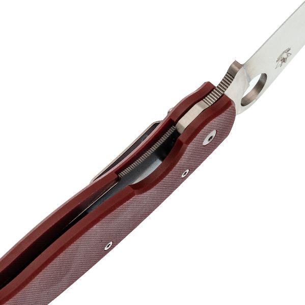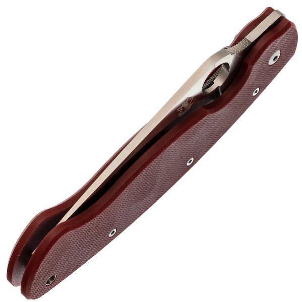 Клинок выполнен в форме Drop-Point, которая обеспечивает хорошую проникающую способность и эффективный рез. Клинок выполнен из стали D2, которая славится своей высокой твёрдостью и отличной износостойкостью. Это инструментальная сталь американского производства. D2 одна из самых популярных ножевых сталей в мире. Она содержит 12% хрома, что не позволяет ей называться нержавеющей, поэтому после работы с ножом, клинок необходимо протирать насухо. Из положительных характеристик стоит отметить, что она хорошо держит режущую кромку острой и обладает неплохой ударной вязкостью. Клинок обладает хорошей проникающей способностью. Сатиновая обработка клинка придаёт ему элегантный матовый блеск. Открывается он с помощью подпальцевого отверстия, что обеспечивает плавное и удобное открытие. Рифление на обухе позволяет контролировать нож при выполнении точных и силовых работ, а замок Liner-lock надёжно фиксирует клинок в открытом положении.