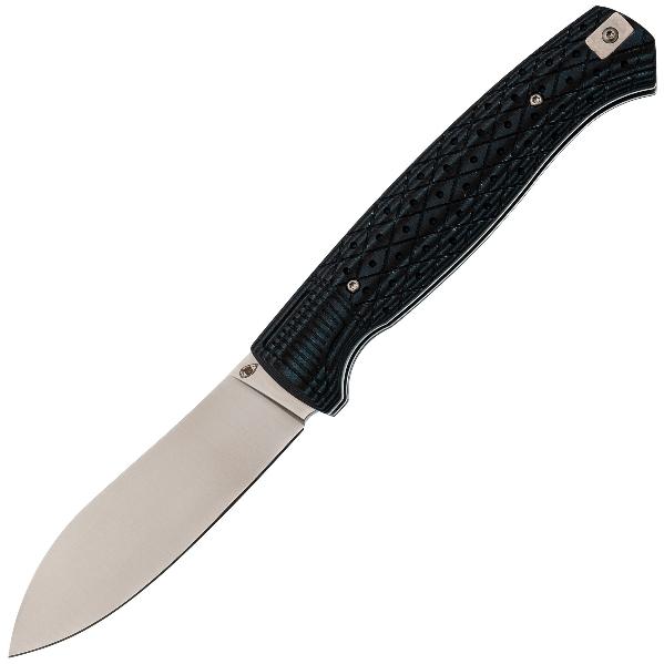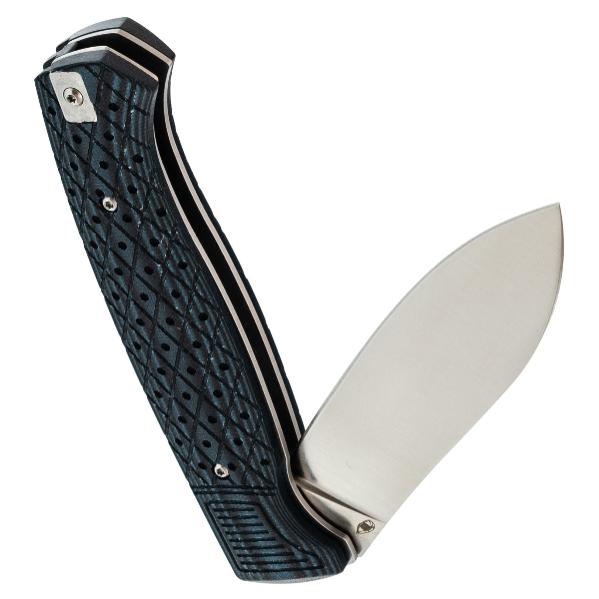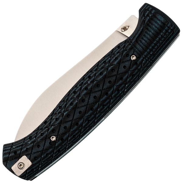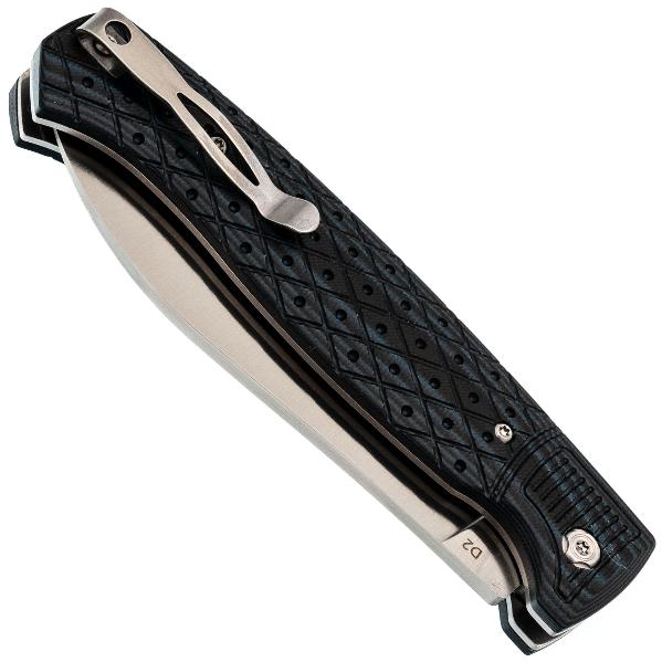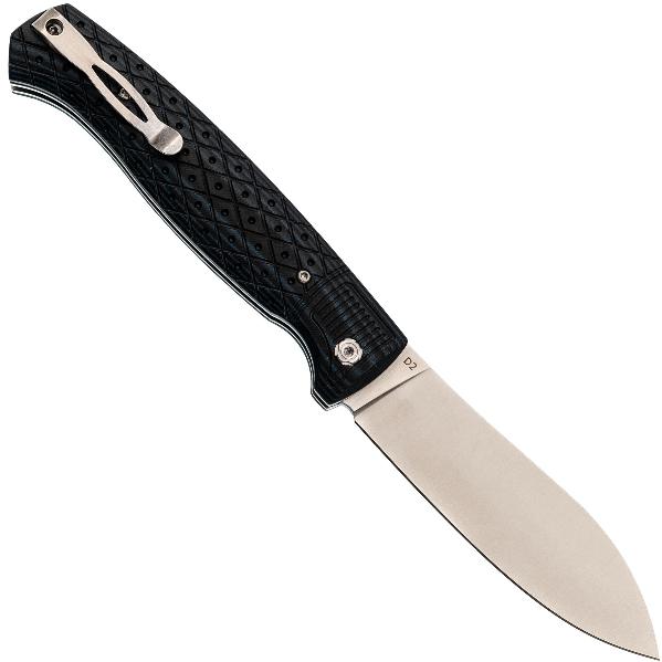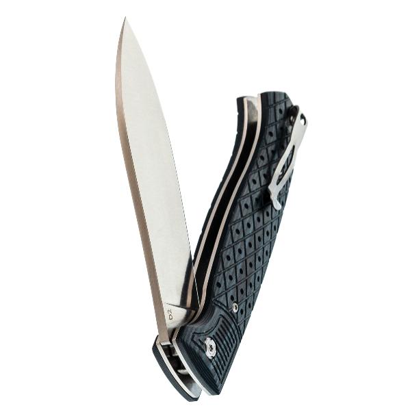 Клинок формы Drop-point выполнен из стали D2, характеризующейся высокой твердостью, отличной износостойкостью, неплохой стойкостью к коррозии и длительным удержанием остроты режущей кромки. Это инструментальная сталь американского производства. D2 одна из самых популярных ножевых сталей в мире. Она содержит 12% хрома, что не позволяет ей называться нержавеющей, поэтому после работы с ножом, клинок необходимо протирать насухо. Из положительных характеристик стоит отметить, что она обладает неплохой ударной вязкостью. Сатиновая обработка клинка придаёт ему благородный внешний вид и эффективно скрывает следы эксплуатации. Высокие плоские спуски обеспечивают хороший рез. Фиксация и раскрытие клинка происходит при помощи замка Phantom Lock. Это тип замка для складных ножей, разработанный компанией Spyderco. Его механизм с уникальной конструкцией, который скрывается в рукоятке. Смещение плашки рукояти мгновенно раскрывает нож, при этом замок надёжно фиксирует клинок, исключая случайное закрытие. Такое решение делает процесс открывания и закрывания интуитивно понятным и удобным. Важно знать, что при использовании ножа с замком Phantom-Lock рекомендуется очищать фиксирующую выемку на клинке от пыли, иначе замок не будет полностью фиксировать клинок.