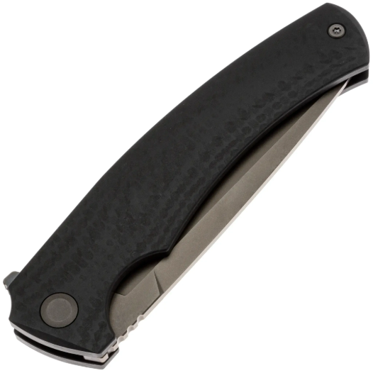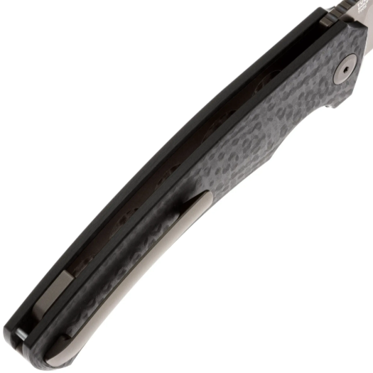 Рукоять ножа выполнена из G10, покрытого слоем карбона. Карбон — композит из переплетённых нитей углеродного волокна и полимерной (чаще — эпоксидной) смолы. Карбон легче традиционных материалов, таких как дерево или сталь. Он прочен на разрыв и сжатие, устойчив к механическим повреждениям и к воздействию окружающей среды — карбоновая рукоять не боится влажности, плесени и гниения, но несмотря на высокую прочность, карбон может быть более хрупким по сравнению с некоторыми другими материалами, ударные нагрузки могут вызывать трещины Нужно оберегать рукоятку от падений или ударов о жёсткую поверхность — при внезапном падении или резком ударе углеволоконная сетка может деформироваться. Карбон сохраняет свои свойства при высоких температурах, но нежелательно оставлять такой нож надолго под солнцем — карбон плохо переносит ультрафиолет. Карбон эстетичен - он часто имеет текстурированный или матовый вид. G10 — это композитный материал, в основе которого лежат стеклоткань и эпоксидная смола. Стекловолокно вымачивается в эпоксидной смоле, после чего подвергается сжатию. На выходе получается прочный и неприхотливый материал, устойчивый к ударам, влаге и высокой температуре. G10 прекрасно противостоит агрессивной внешней среде, благодаря чему имеет высокую популярность у производителей фиксированных и складных ножей. Внешне G10 похож на микарту, но превосходит её в прочности и огнестойкости. Также на рукояти ножа имеется фрезерованная клипса для ношения.