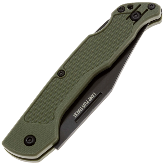 Клинок имеет классическую форму clip-point, обеспечивающую хороший контроль при резе и высокую проникающую способность. Он изготовлен из нержавеющей стали 420, которая отличается высокой коррозионной стойкостью и лёгкостью в заточке, что делает её хорошим выбором для туристических EDC-ножей. Чёрное покрытие защищает клинок от царапин и снижает блики. Для удобного открытия на клинке предусмотрена подпальцевая выемка, а надёжную фиксацию в рабочем положении обеспечивает проверенный временем механизм back-lock, который надёжно удерживает лезвие и предотвращает случайное складывание.