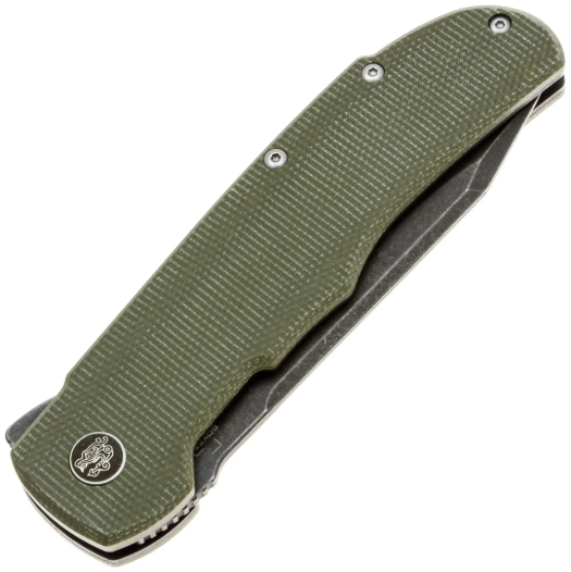 Рукоять изготовлена из микарты. Микарта — это высоко декоративный конструкционный композитный материал, представляющий собой слоистый пластик на основе ткани или бумаги и полимерного связующего вещества (синтетической смолы). Макарта прочная, нескользкая, не впитывает запахи и комфортная для руки. Кроме того, материал красив, долговечен, хорошо переносит значительные перепады температуры, не вступает в реакцию со многими химическими веществами и имеет широкую цветовую гамму. Эти качества делают его более востребованным в ножевой индустрии, чем обычный пластик или дерево. Оливково-зелёная окраска рукояти Tac-Master подчёркивает его тактическую направленность и гармонично сочетается с матовой отделкой клинка. Эргономичная форма рукояти обеспечивает надёжный хват и комфорт при длительном использовании, а все грани аккуратно обработаны для приятных тактильных ощущений. Визуальной изюминкой является декоративный винт оси спереди, украшенный логотипом Terzuola Design в виде головы дракона - фирменной черты мастера. Для удобства ношения нож оснащён стальной клипсой типа Tip-up, а также предусмотрено темлячное отверстие.