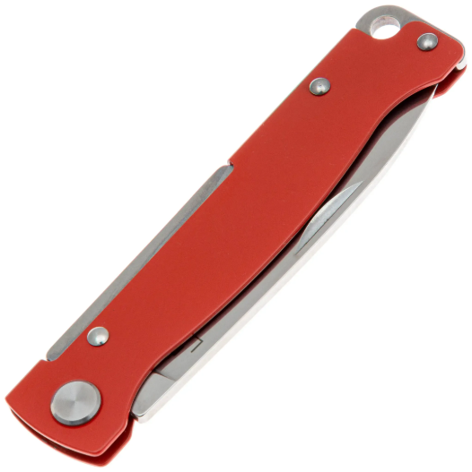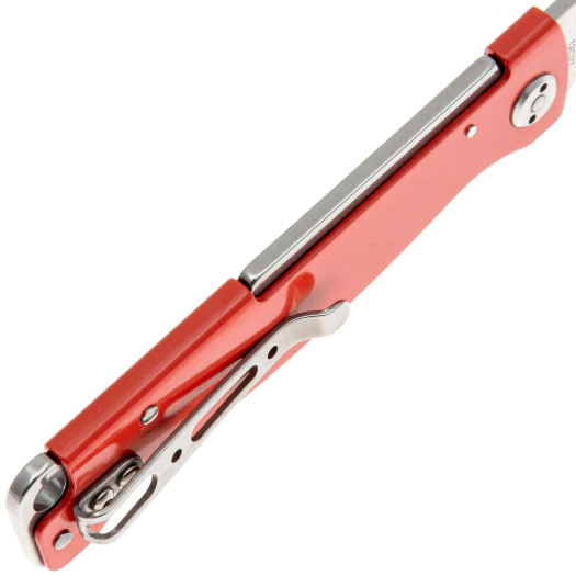 Рукоятка изготовлена из нержавеющей стали с ярким красным покрытием - прочного и коррозионно-стойкого материала, который обеспечивает оптимальный баланс между весом и долговечностью. Длина рукояти гарантирует надёжный хват и комфорт при использовании. Все элементы конструкции аккуратно обработаны, что делает нож приятным в руке даже при продолжительной работе. Для удобства ношения нож оснащён карманной клипсой в положении tip-up для правой стороны, которая надёжно фиксирует нож в кармане. Также предусмотрено темлячное отверстие для крепления страховочного шнура или декоративного темляка.