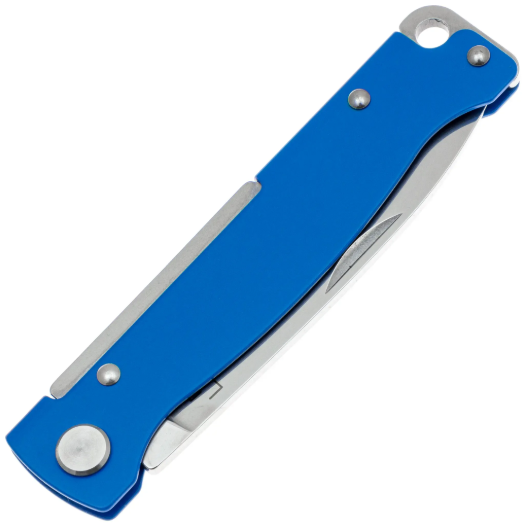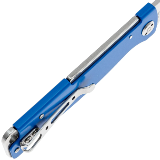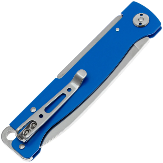 Рукоятка изготовлена из нержавеющей стали с ярко голубым покрытием - прочного и коррозионно-стойкого материала, который обеспечивает оптимальный баланс между весом и долговечностью. Длина рукояти гарантирует надёжный хват и комфорт при использовании. Все элементы конструкции аккуратно обработаны, что делает нож приятным в руке даже при продолжительной работе. Для удобства ношения нож оснащён карманной клипсой в положении tip-up для правой стороны, которая надёжно фиксирует нож в кармане. Также предусмотрено темлячное отверстие для крепления страховочного шнура или декоративного темляка.