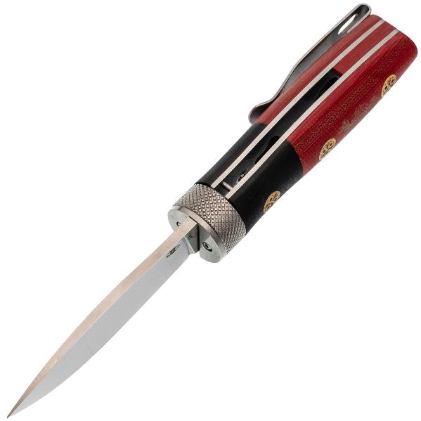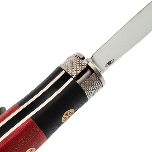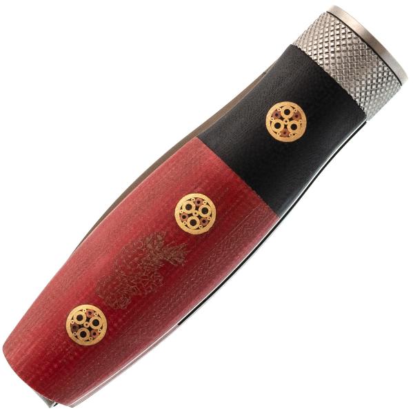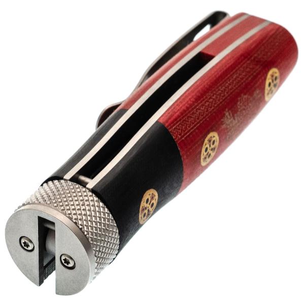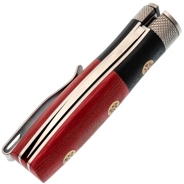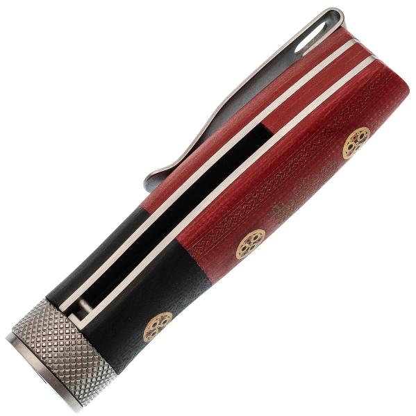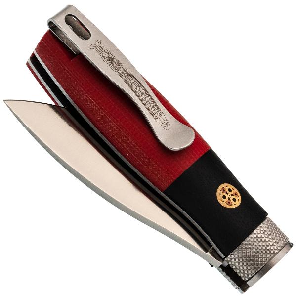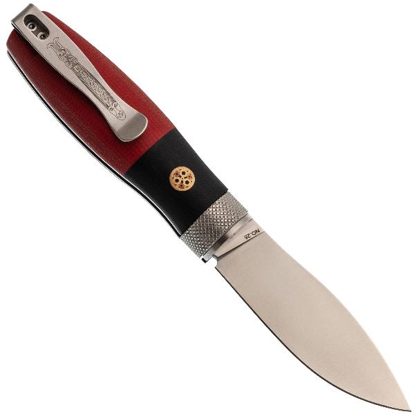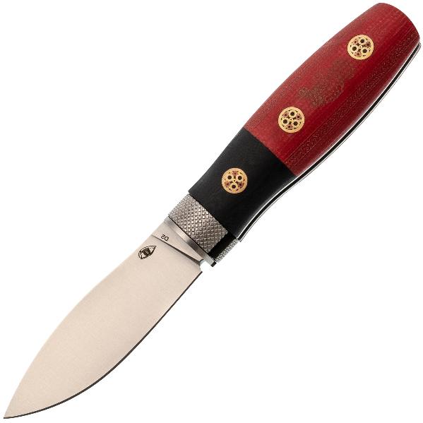 Рукоять ножа выполнена из G10, что гарантирует надёжный и комфортный хват в любых условиях. G10 — это композитный материал, в основе которого лежат стеклоткань и эпоксидная смола. Стекловолокно вымачивается в эпоксидной смоле, после чего подвергается сжатию. На выходе получается прочный и неприхотливый материал, устойчивый к ударам, влаге и высокой температуре. G10 прекрасно противостоит агрессивной внешней среде, благодаря чему имеет высокую популярность у производителей фиксированных и складных ножей. Такие ножи могут иметь самый широкий спектр применения от EDC, до работы в экстремальных условиях. Ещё одно преимущество это стеклотекстолита – он легко поддаётся окрашиванию в любые цвета. Внешне G10 похож на микарту, но превосходит её в прочности и огнестойкости. Декоративные пины на рукояти придают ножу утончённый внешний вид. Поверхность рукояти слегка текстурирована, что обеспечивает надёжный хват. Для удобного ношения предусмотрена стальная клипса, чтобы надёжно фиксировать нож в кармане или на снаряжении.
