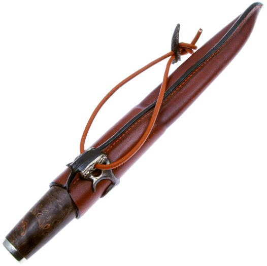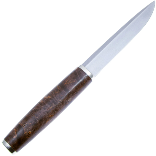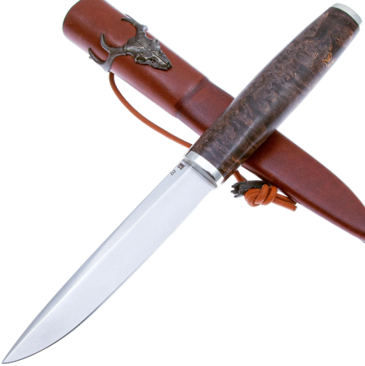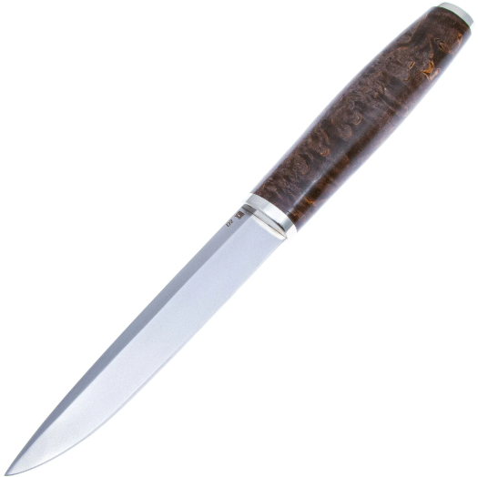Рукоять ножа выполнена из стабилизированной карельской берёзы. Стабилизированная - это пропитанная полимерными растворами древесина, отличающаяся большой устойчивостью к воздействию влаги, износостойкостью и прочностью. Карельская берёза - это сочетание красоты и функциональности. Её уникальный выразительный рисунок придаёт каждому ножу эксклюзивность и эстетическую ценность, что особенно ценится коллекционерами. Кроме того, карельская берёза обладает высокой прочностью и устойчивостью к износу, что делает её идеальной для интенсивного использования, Берёза хорошо переносит влагу, что делает её подходящей для использования ножей в различных условиях, включая открытый воздух и повышенную влажность. Нож обладает удобной рукоятью, которая приятна на ощупь и хорошо держит тепло.