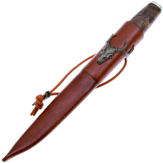 В комплекте с ножом идут ножны, выполненные из натуральной кожи с литьем в виде черепа.